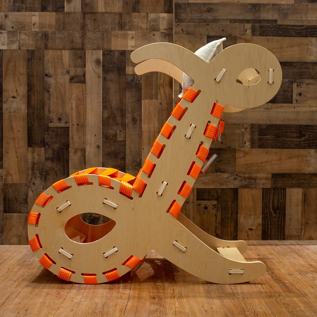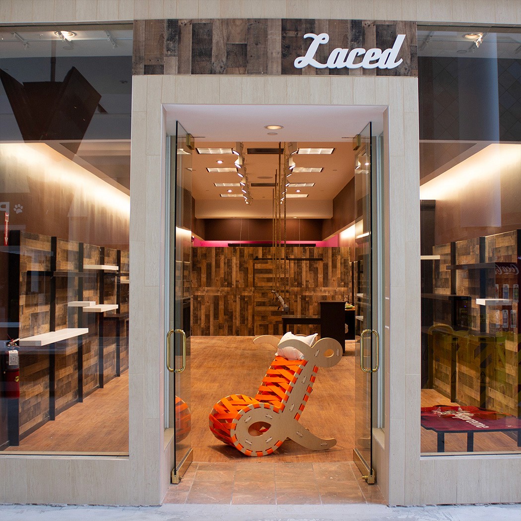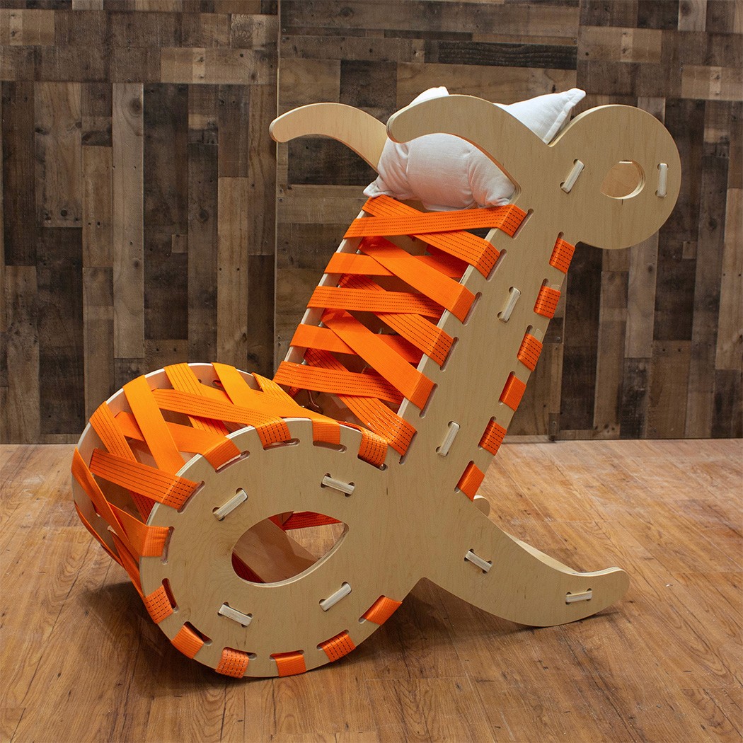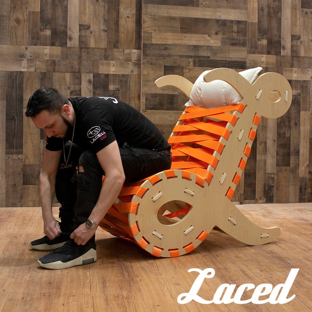 Laced was a Boston-based sneaker boutique. I designed a lounge chair based on the script "L" from the Laced logo, held together in tension from two ratchet straps which meant to imitate shoe laces.