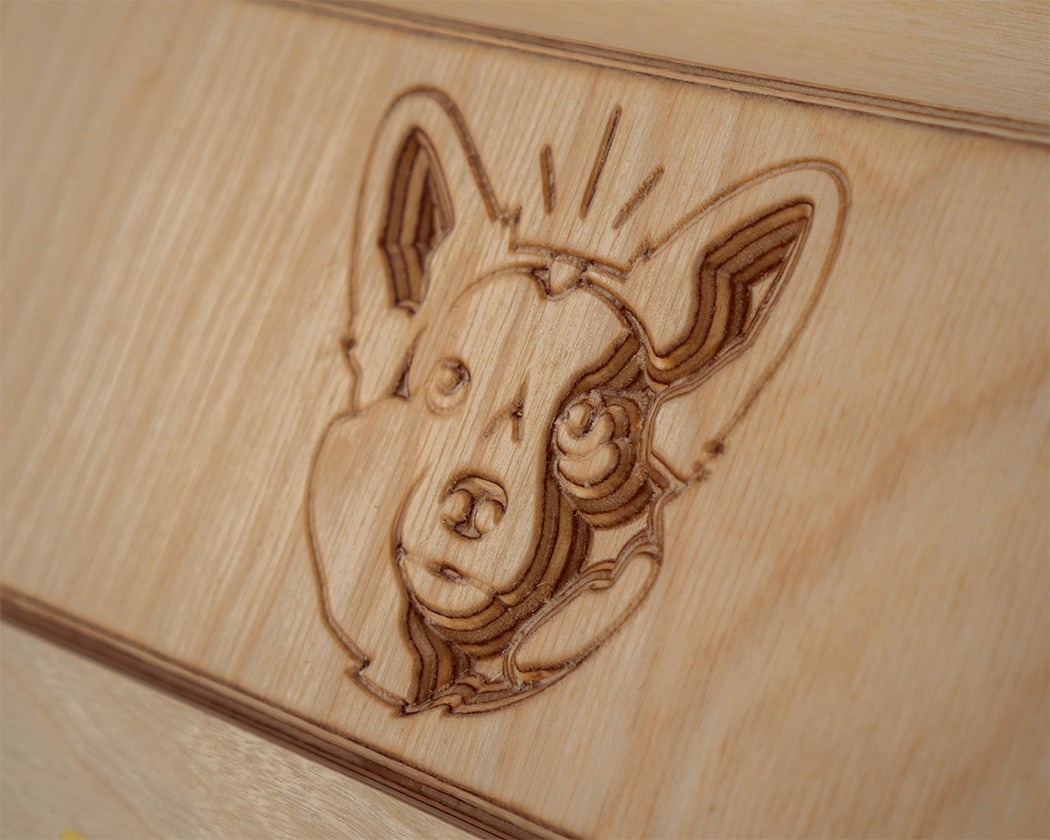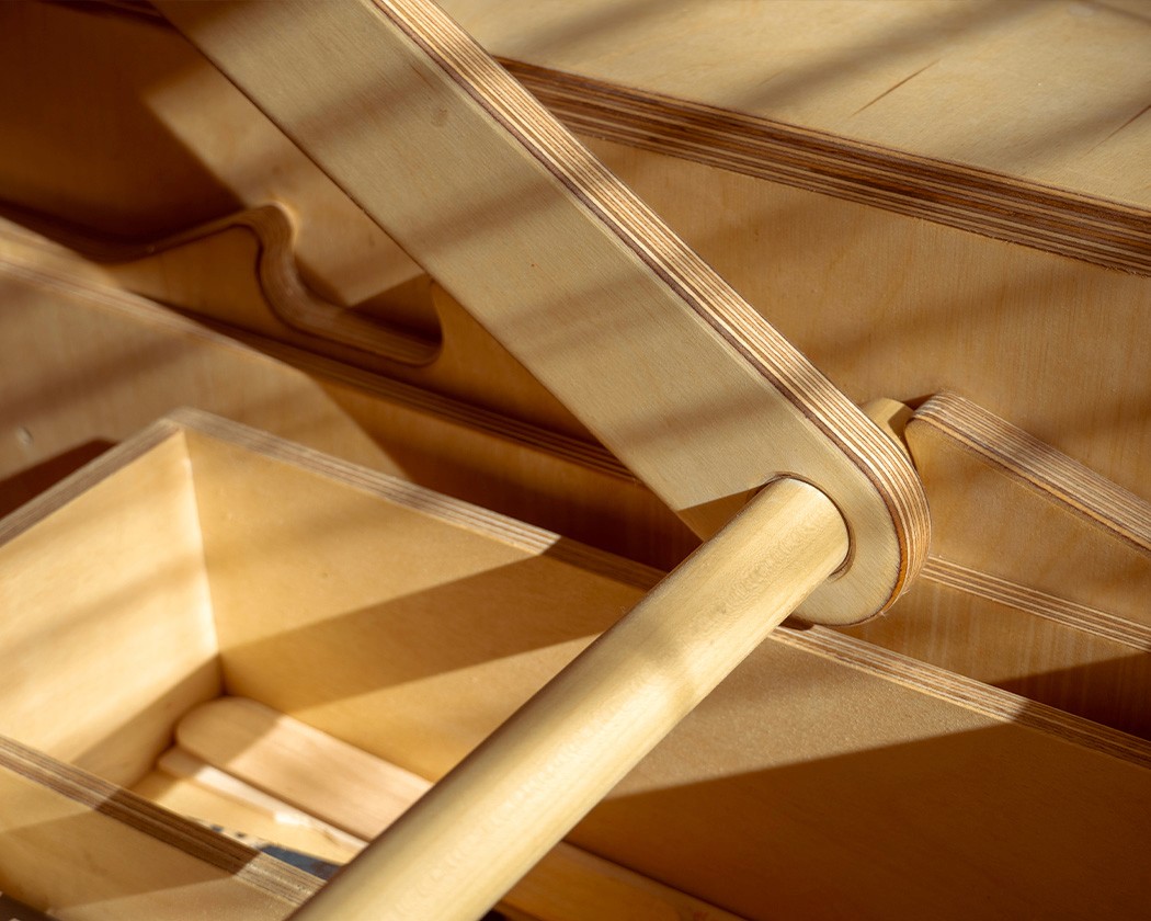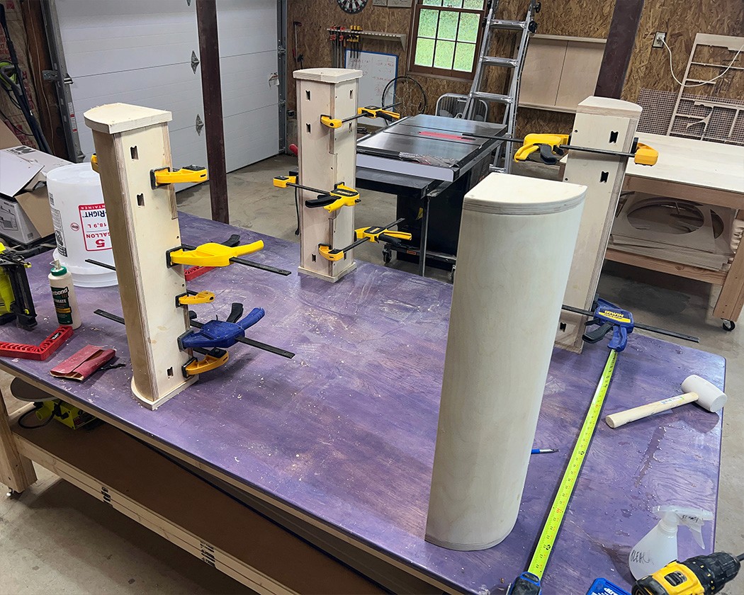 Mix of CNC and tablesaw-cut 3/4" Baltic Birch plywood. Legs were internally kerfed for curved corners.