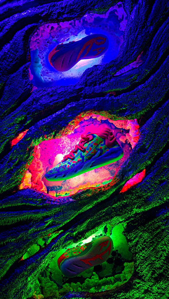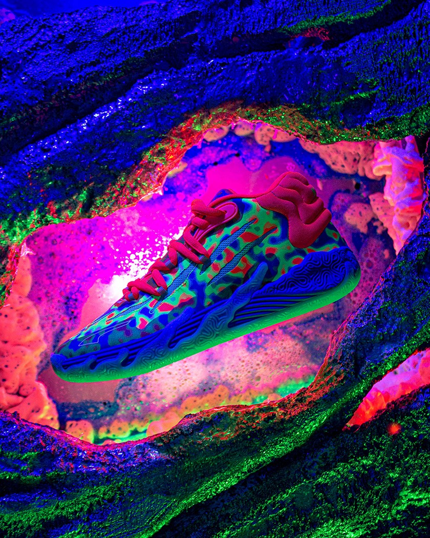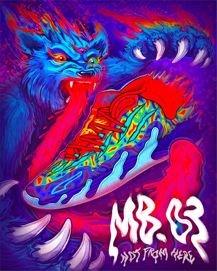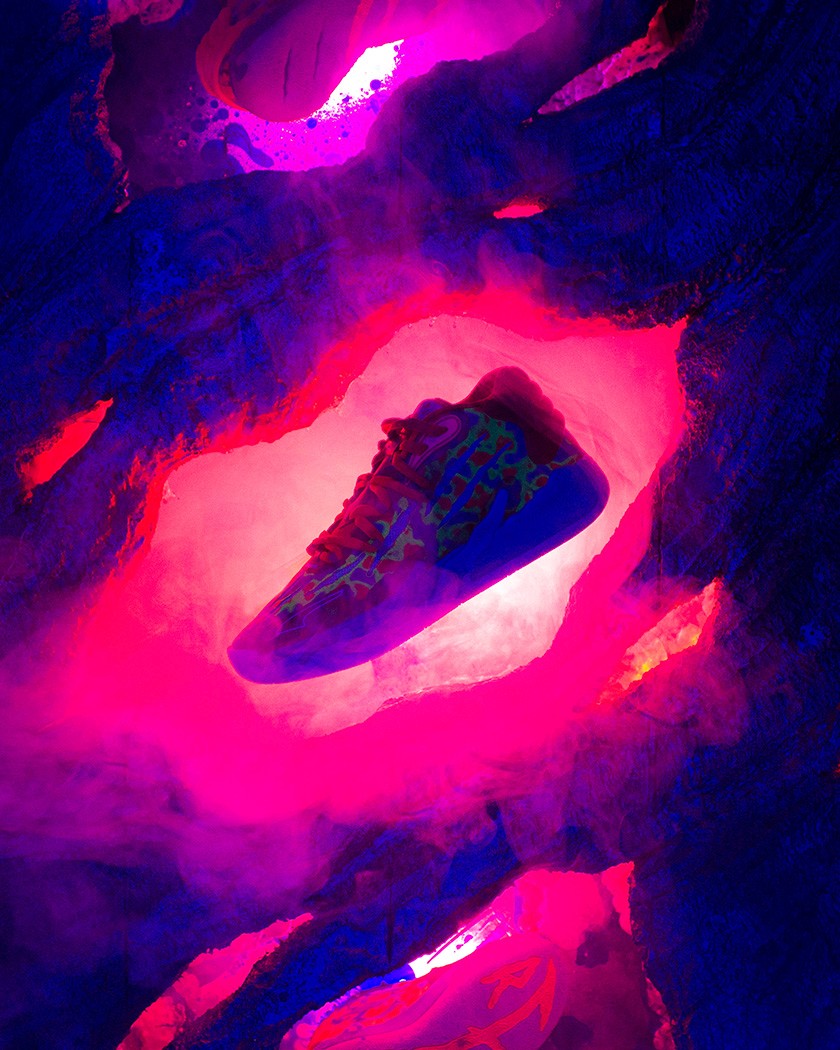 Continuing Melo's "Not From Here" marketing campaign, Melo's third signature basketball shoe — MB.03 — comes to us straight from the alien underworld. The shoe bears scars, alien textures, and toxic slime residue from being in the dangers of Melo's alien home planet. Proceed with caution.
